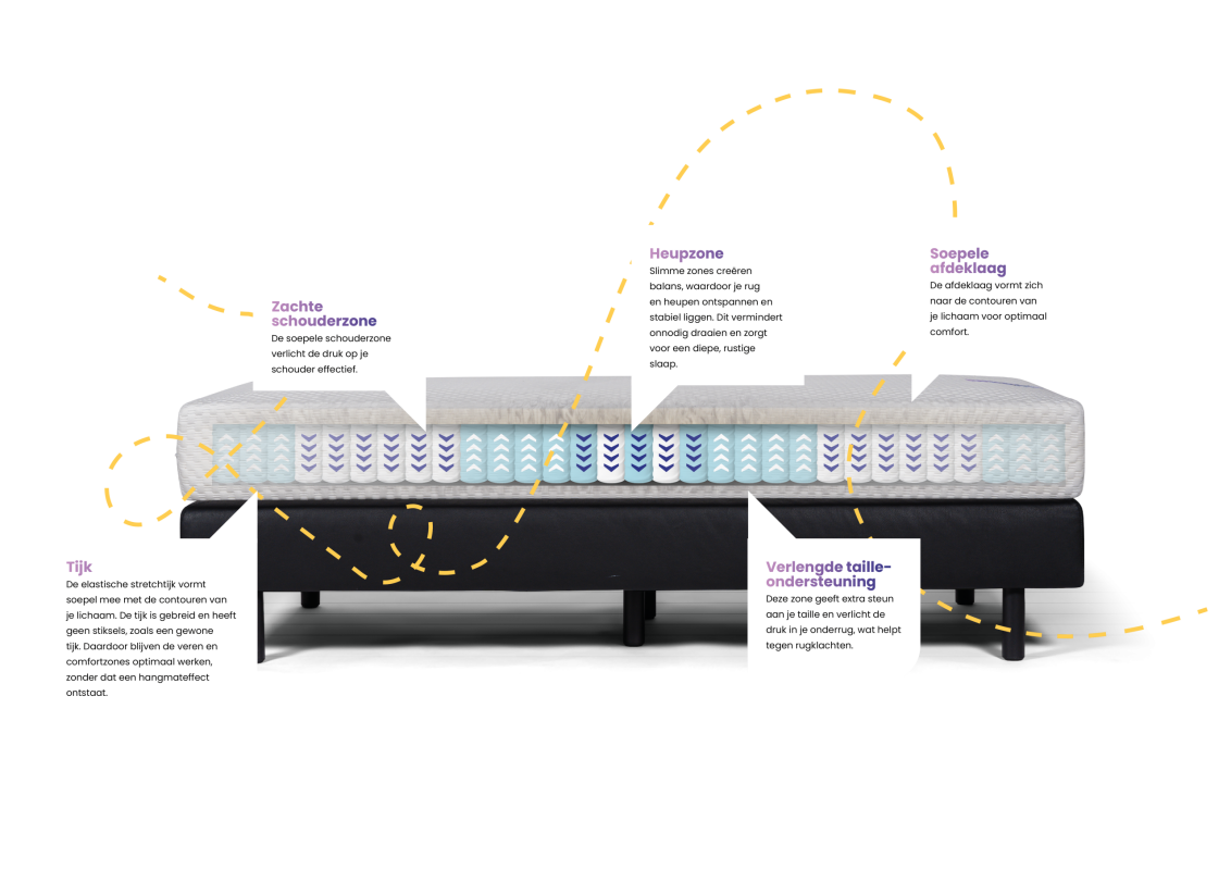 Onze matrassen bestaan uit verschillende delen (comfortzones), die harder of zachter zijn. De zone bij je schouders is erg zacht, om zo druk op dit deel van je lichaam te voorkomen. De taillezone is harder, loopt verder door en draagt zo jouw lichaam. De heupzone heeft meerdere harde en zachte delen, om stabiliteit te geven aan het zwaardere en harde deel van je lichaam.